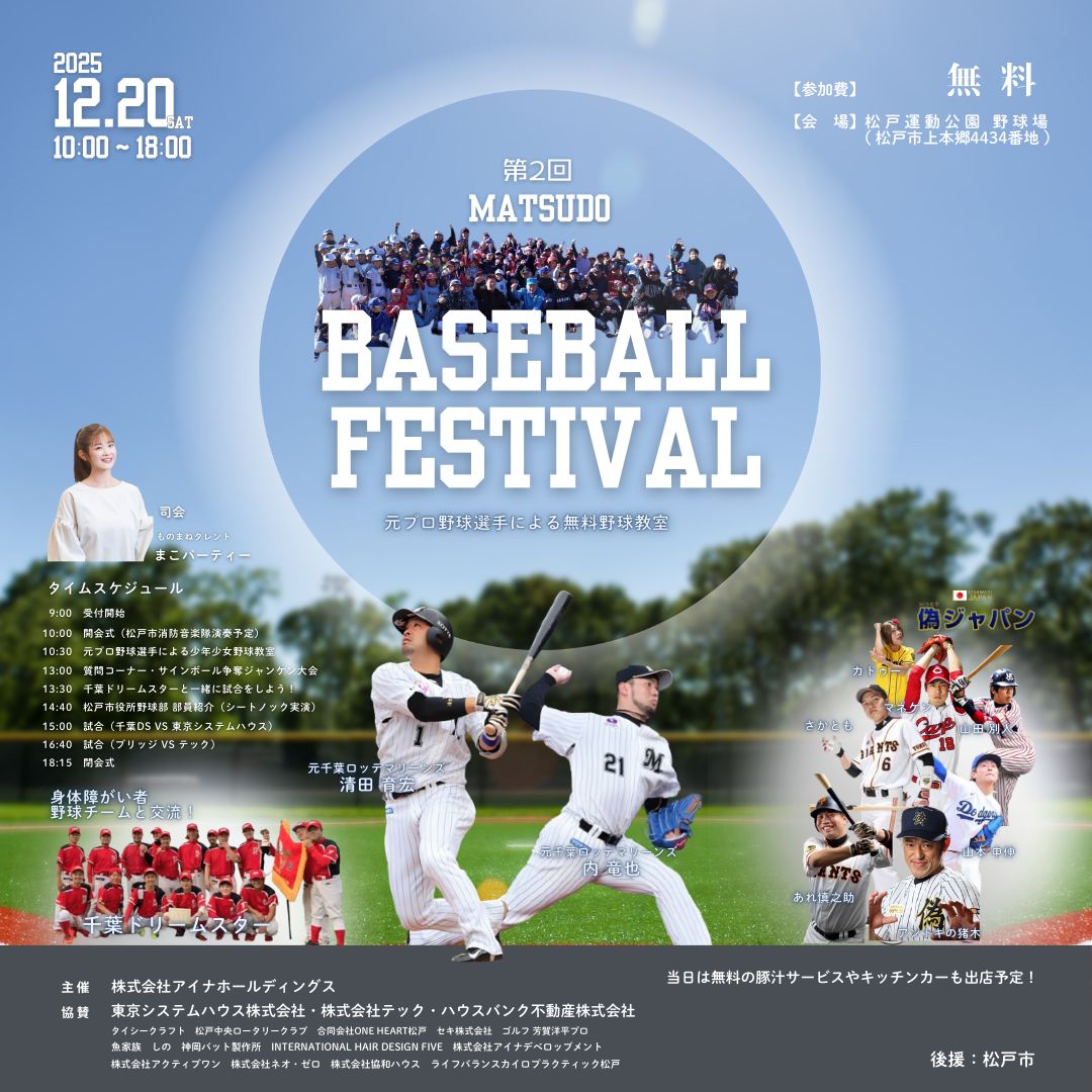 昨年開催された【第1回 MATSUDO BASEBALL FESTIVAL】では、150名を超える野球少年少女が参加し、元プロ野球選手の 清田育宏さん、内竜也さん、羽生田忠克さん からの熱い指導を受ける貴重な機会となりました!